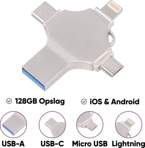 A high-quality 4 in 1 USB flash drive 3.0, for iPhone iPad Android, 128GB, perfect for various flash drive applications, including storing, transferring, and more. This flash drive features a reliable performance and a durable design, making it ideal for storing and transferring.
